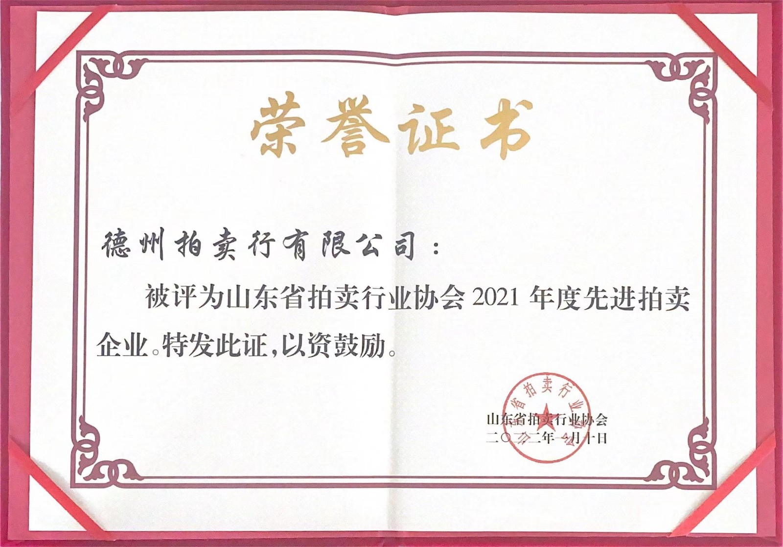 先進拍賣企業(yè)榮譽證書